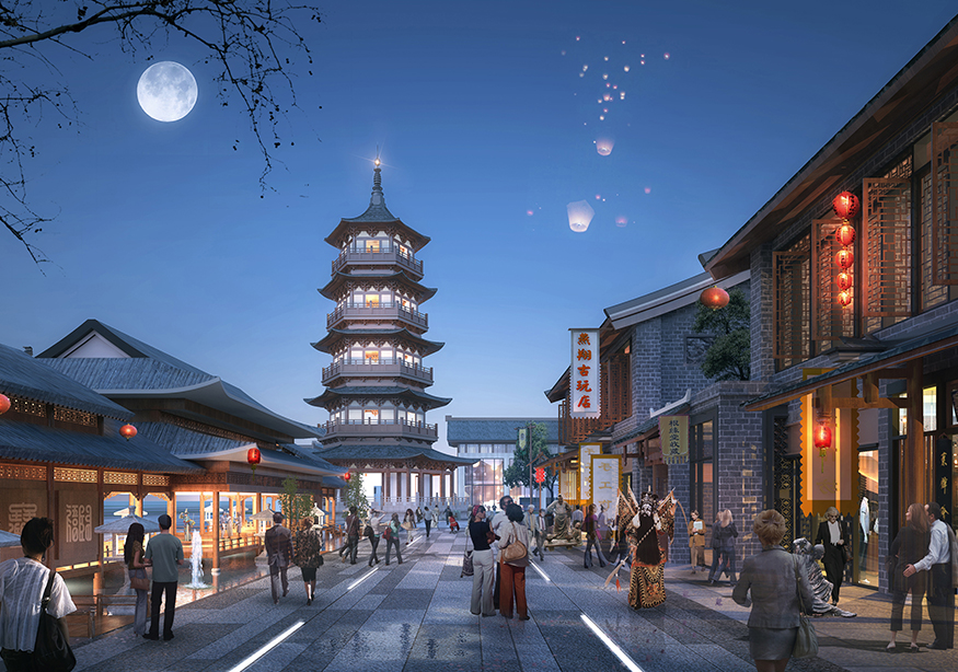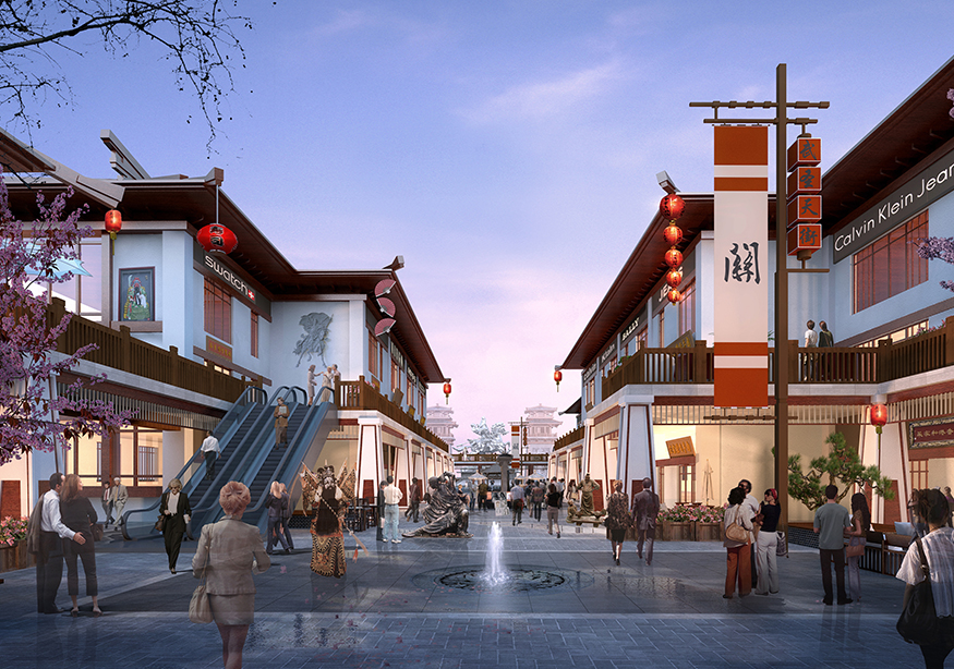 ? ? 文化商業街的設計頗具匠心,從入口處開始,至文化商業街出口處結束,整個用關羽輝煌起伏的一生為時間線進行貫穿。如果說整條街區是關羽在世生而仁、仁而勇、勇而義、義而忠的再現,那么從街區的出口處就是關羽侯而王、王而帝、帝而圣、圣而天文化升華的開始。讓體驗者通過關公精神,體驗現代旅游綜合商業區,建設一個集餐飲休閑、旅游度假為一體的傳統古典園林式的商業綜合體。