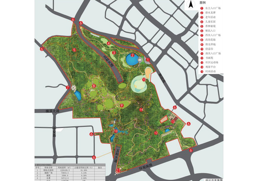 ?1、公園游人容量:公園總面積為 133 公頃,游人容量根據《公園設計規范》,按市、區級綜合性城市公園,水面和坡度大于 50%的陡坡山地面積之和超過總面積的 70%的公園,游人人均占有公園面積應適當增加,本次設計按 100 平方米 / 人計算,故公園游人容量為1330000/100=1.33 萬人。 2、分區設計:依據現狀基地條件及功能需求共分 5 個區,A 時尚游憩綜合區、B 生態花山攬勝區、C 紅葉綠谷創意區、D 高崗花海文化區、E 香林秘境探幽區。