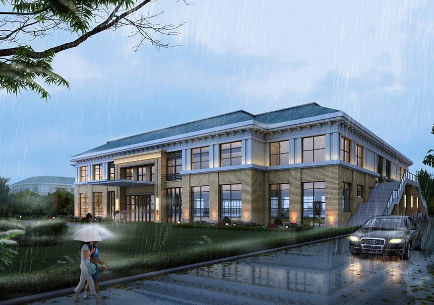 建筑色彩以淺黃色系列為主,風格為“現(xiàn)代中式”建筑風格。